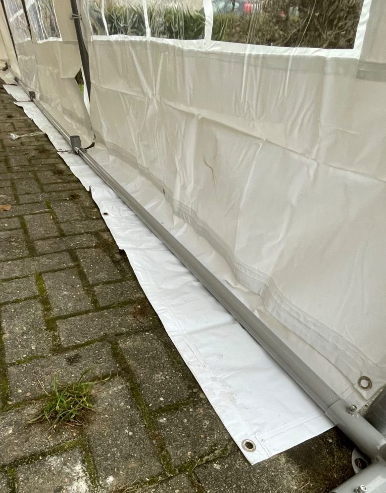 Der zusätzliche Bodenrahmen wird von den Seitenplanen umschlungen. Hierdurch werden diese sicher auf dem Boden gehalten. Das Ergebnis: Kein Wind zieht darunter hindurch, kein Wasser spritz von Außen hinein.